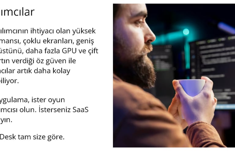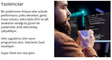 Bir yazılımcının ihtiyacı olan yüksek performansı, çoklu ekranları, geniş masa üstünü, daha fazla GPU ve çift anakartın verdiği öz güven ile yazılımcılar artık daha kolay çalışabiliyor.